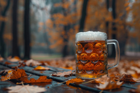 A clear mug filled with golden beer stands atop a rustic wooden table while colorful autumn leaves create a warm backdrop. The ambiance reflects the cozy vibes of fall.