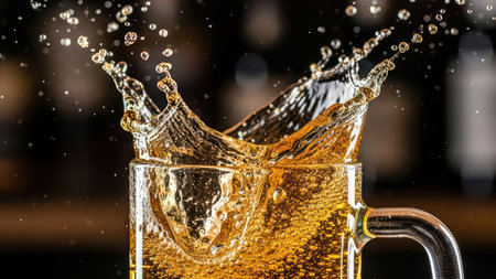 Dynamic splash of amber beer in glass mug capturing the essence of refreshment and celebration.