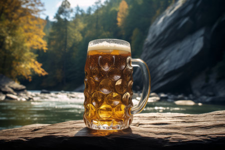 Refreshing Brew with a Riverside Twist: A Mug of Fresh Beer Perched upon a River Rock