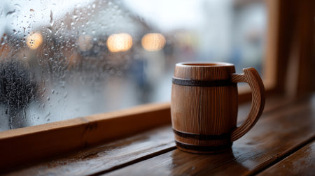 A wooden mug sitting on a window sill in the rain.
