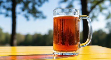 Refreshing cold amber beer in a clear glass mug on a yellow outdoor table with sunlight and green blurred trees in the background.