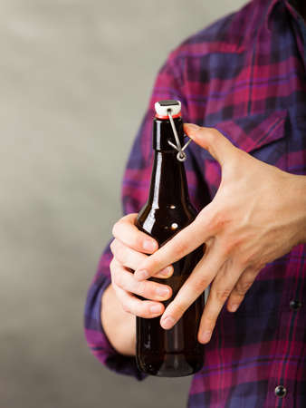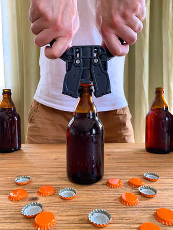 Craft beer brewing at home, man closes brown glass beer bottles with plastic capper on wooden table with orange crown caps. Vertical image