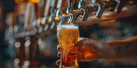 Cold, foamy beer being poured into a glass with vivid bubbles and golden amber tones, perfect for refreshing drink or pub-themed concepts.