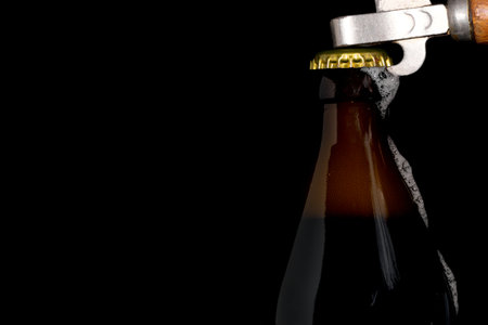 Closeup man hand opening beer glass bottle with opener in super slow motion. Bubbling foam raising up from dark bottleneck on white background. Fizzy lager alcohol beverage foaming. Party concept