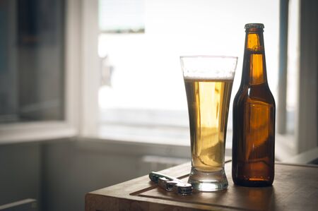 Bottle and glass of beer and a corkscrew on wooden surface with blurred background and cinematic color grading