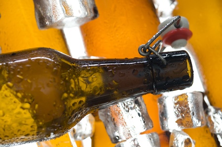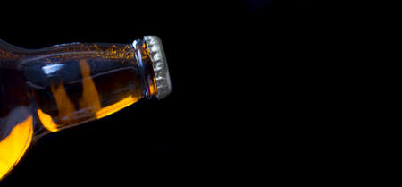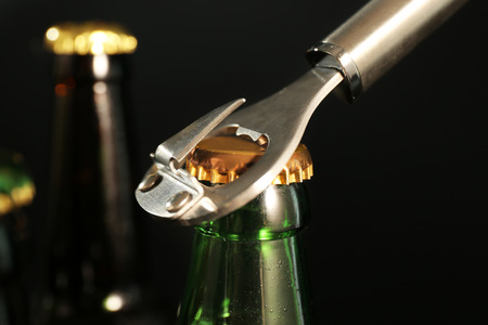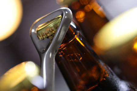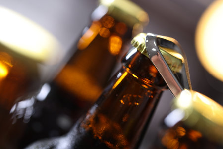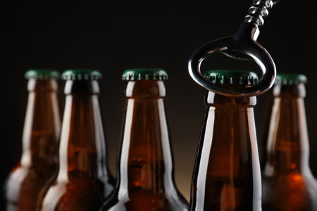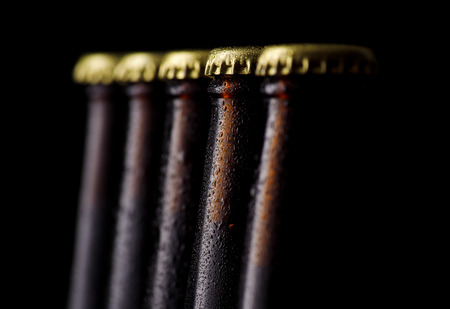 Row brown ice cold beer bottle with water drops and metal opener cap, dark background