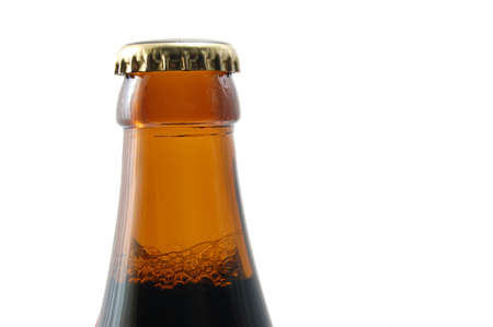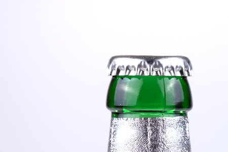 Bottleneck and bottle cap on a green beer bottle on bright background