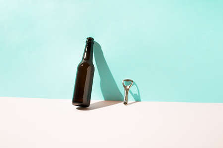 Brown beer bottle and metal bottle opener leaning against the wall with sharp shadow. Minimal summer concept.