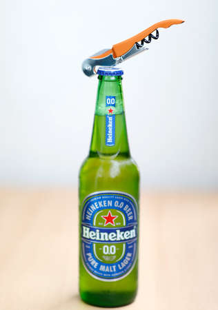Green glass Heineken beer bottle and bottle opener. September 12, 2020 Warsaw, Poland