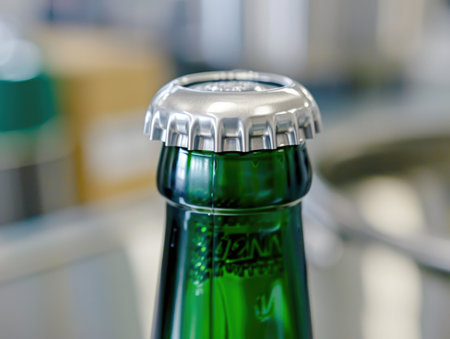 A close up of a vibrant green beer bottle being uncapped with a standard scale in the background.