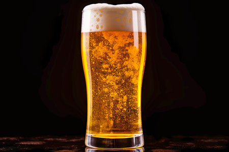 Refreshing tall glass of beer with frothy head on a wet surface, studio shot showcasing cool drink
