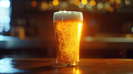 AI Generated. A glass of beer sits on a wooden bar counter