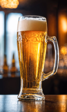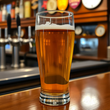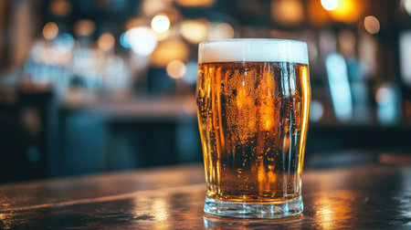 A tall glass of beer sits on a wooden bar counter, illuminated by warm lights, creating a cozy atmosphere for patrons to enjoy.