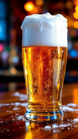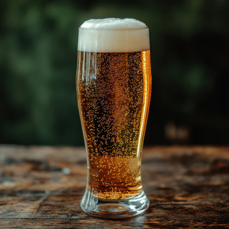 A refreshing glass of amber beer sits on a rustic table, showcasing froth and condensation. Perfect for social gatherings or relaxing moments.