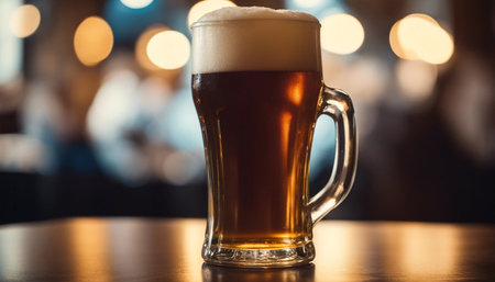 Frothy beer glass on table at dark bar establishment, nightlife celebration generated by artificial intelligence