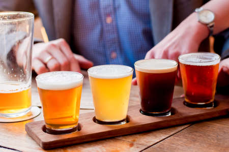 Tasting of different varieties of beer in a pub. Selective focus.