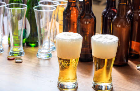 Assorted beers for tasting. Different sorts of draft beers. Set of alcoholic beverage.