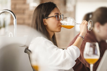 Woman Sommelier Tasting Beer During Training Beer School. Alcoholic Beverages Degustation Courses.