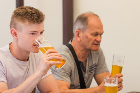 Two men adult son and senior father drinking light beer, cheering together and having a discussion on czech pub terrace.
