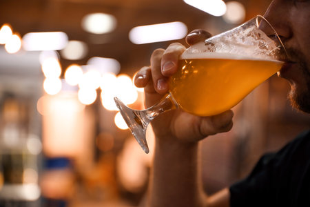 Man holding a glass of craft beer in a brewery or bar, representing a casual drink or tasting experience. copy space.