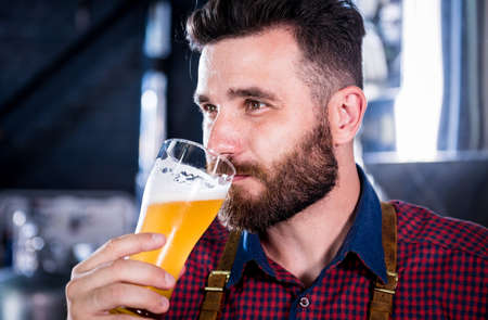 Young brewer wearing a leather apron is testing beer at a modern brewery