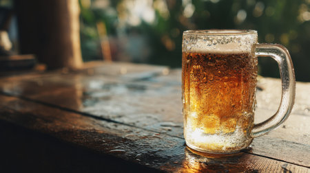 A chilled mug of beer sits on a rustic wooden table, capturing the essence of relaxation in a warm and inviting outdoor setting.