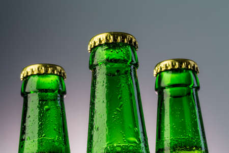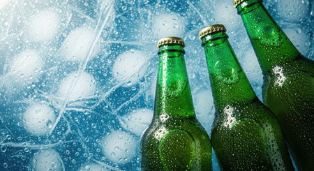 Bottles of beer on a blue background with drops of water.