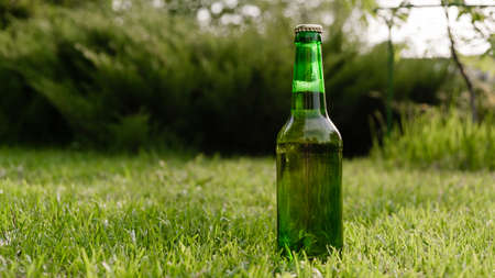 Green glass bottle of beer on the grass
