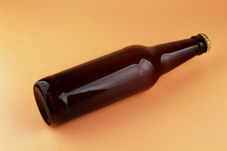 Brown, glass beer bottle on a light colored background.