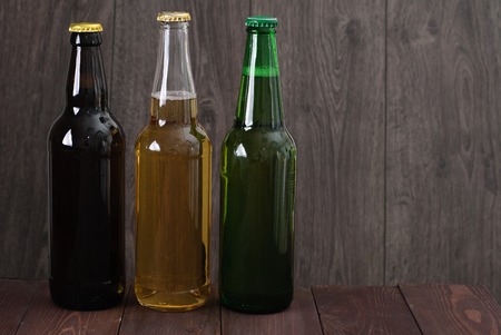 Green and brown glass bottles of beer on table over wooden background, close up