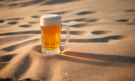 Sunlight highlights a glass of beer placed on a table, creating a refreshing atmosphere.