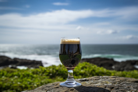 glass of beer against sea