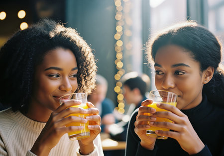 Two smiling young black women enjoy a refreshing glass of orange juice together in a sunlit cafe, capturing a moment of friendship, health, and relaxation. perfect for lifestyle and beverage content.