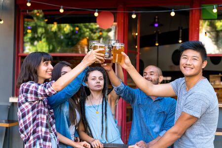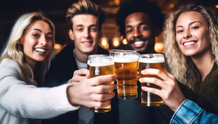Generative AI : Happy multiracial friends cheering beer glasses at brewery pub garden Group of young people enjoying dinner party eating and drinking at bar restaurant Friendship