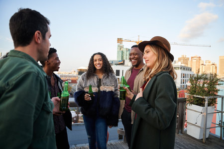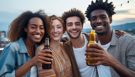 Revelling in Diversity: Friends Embrace Joy, Toasting with Beer Bottles on Rooftop