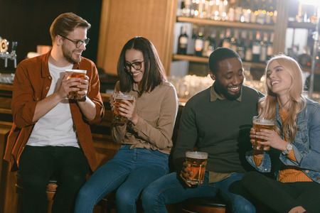 Group of friends drinking beer and having fun in a pub. Cheerful young men and women drinking beer together.