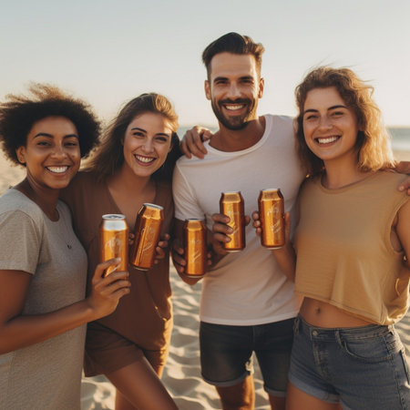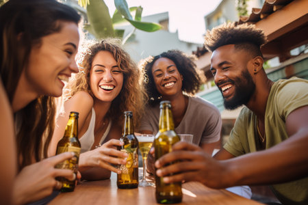 Generative AI : Group of multiethnic happy friends having party outside celebrating toasting beer bottles on sunset Young people hanging out drinking alcohol together Celebration