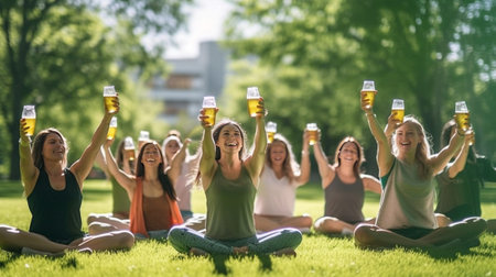 Best weekend ever Group of young smiling people in casual wear toasting with beer while enjoying picnic outdoors : Generative AI