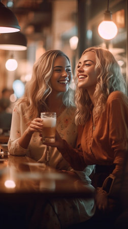 Happy girl friends hanging out in cafe bar after work : Generative AI