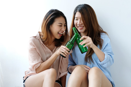 Two asian women drinking beer at party, celebration, LGBT couple, lifestyle