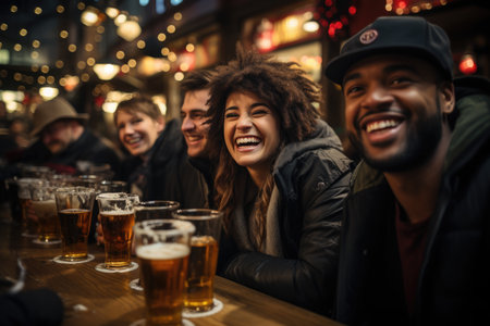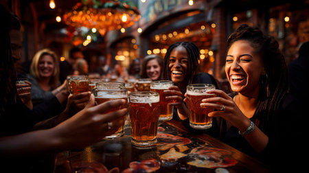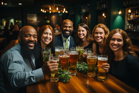 Diverse friends celebrating St. Patricks Day in Irish pub, festive fun atmosphere
