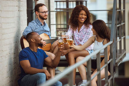 Multiethnic friends toasting beer at rooftop summer party, Group of diverse young people having dining time together at restaurant balcony, Life style with guys and girls hanging together.
