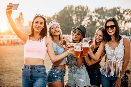 Female friends cheering with beer at music festival, summer beach party, sunset