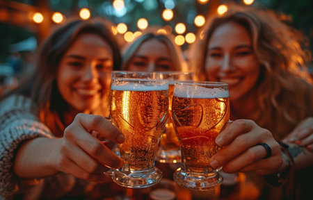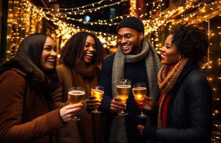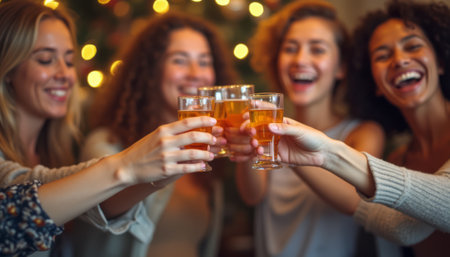 Cheers to friendship and joy A group of four diverse women joyfully clink their glasses filled with golden drinks, radiating happiness against a backdrop of twinkling lights. This vibrant scene captures the essence of celebration, camaraderie, and the warmth of shared moments