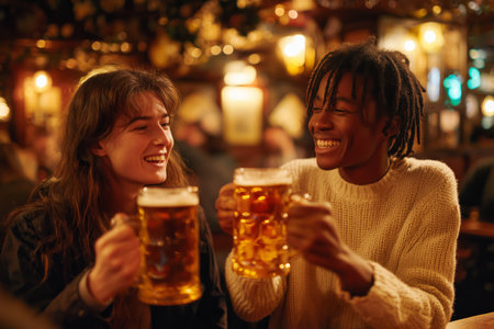 Two friends raise their glasses of beer in a cheerful toast inside a warm and inviting pub. The atmosphere is filled with laughter and a sense of camaraderie.