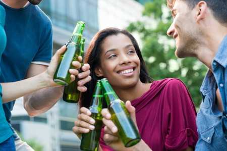 Closeup shot of young friends toasting with bottles of beer. Multiethnic people drinking beer. Happy mem and women smiling and drinking a beer for the aperitif.
