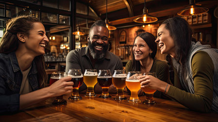 Friends clinking beer glasses during a craft beer tasting session at a cozy brewery, with laughter and conversation filling the air Warm, inviting light