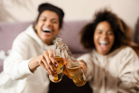 Two happy young african women friends sitting on a couch drinking beer eating popcorn at home toasting