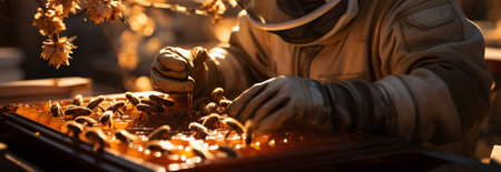 Apiculturist managing honeycomb frames, surrounded by bees. Beekeeper during the honey collection. Concept of bee farming, ecological agriculture, and honey harvest.