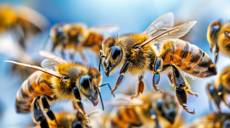 Bees in the blue sky close up, bee oasis, biodiversity concept, banner, empty space
